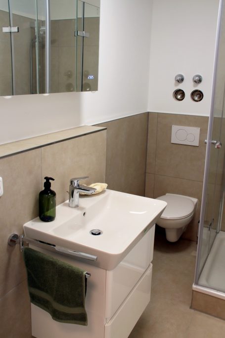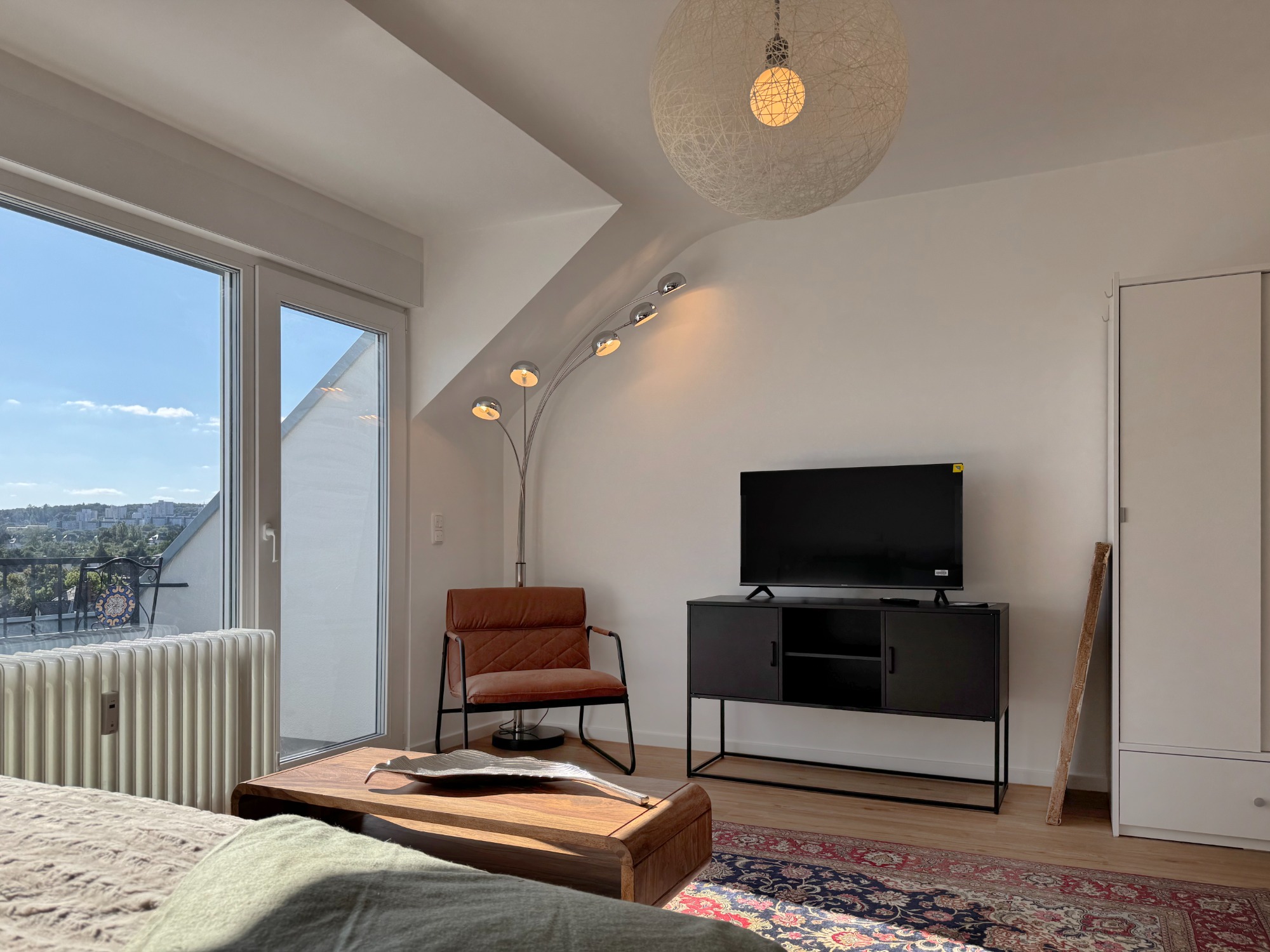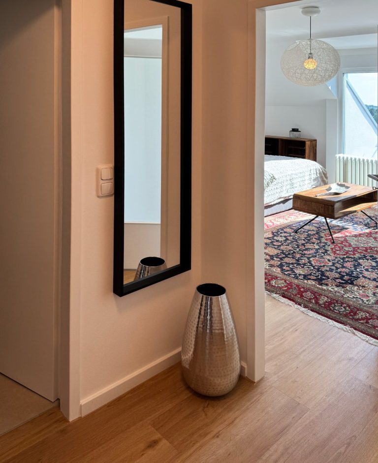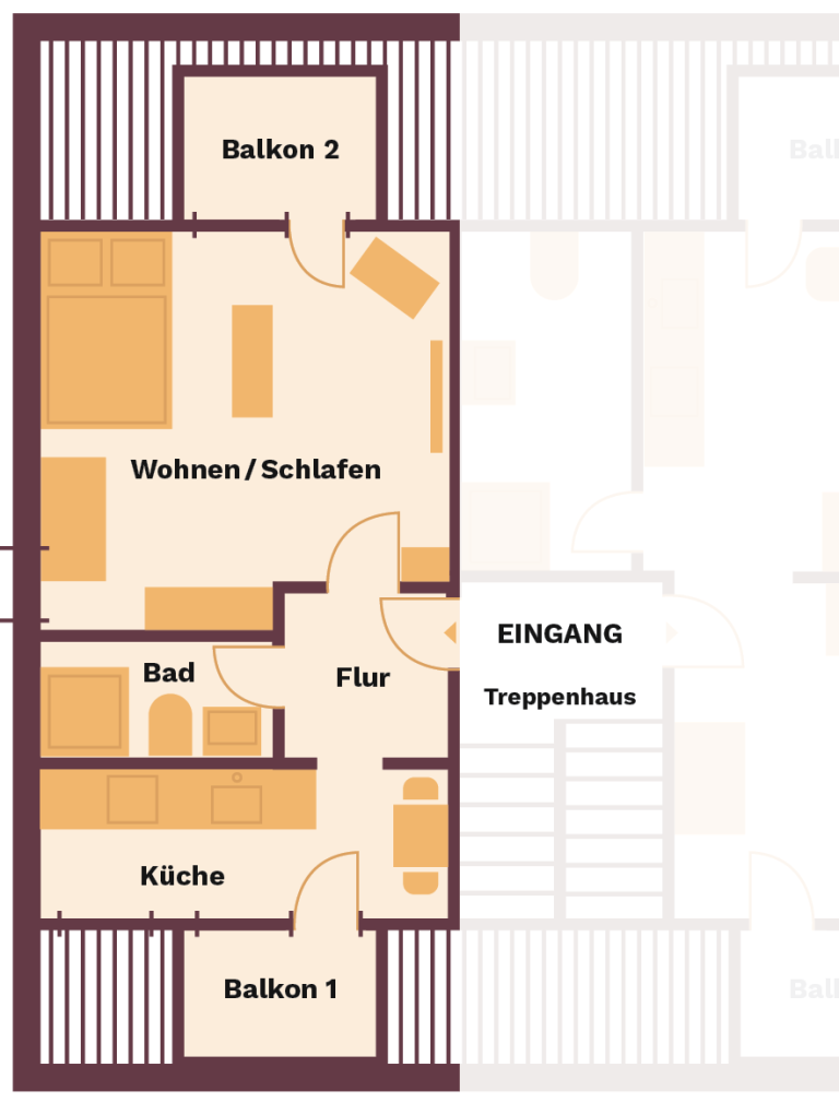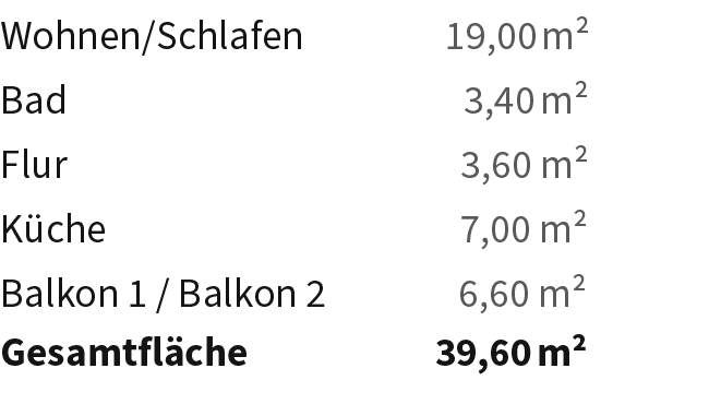 Die Wohnung ist vollständig möbliert und bietet: Einen gut durchdachten Wohn- /Schlafbereich mit hoch-wertigem Bett inkl. Bettkasten für extra Stauraum, Schrank, hochwertige Regale und einen Arbeitsplatz inkl. Smart-TV. Die moderne Einbauküche inkl. Kühlschrank, Herd, Siebträger Kaffeemaschine und Geschirr sowie Gläsern bietet zudem einen kleinen Essbereich für zwei Personen. Ein stilvolles Bad mit Dusche, Spiegel, Handtuchheizkörper, hochwertige Bodenbeläge lassen keine Wünsche offen. Die zwei vorhandenen Balkone runden den Grundriss ab. Stabiles WLAN ist in der gesamten Wohnung verfügbar.